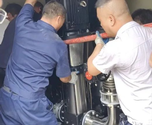 新水泵功率大,重量也非比尋常的設(shè)備,單臺泵重達1000斤,而泵房位置偏僻且面積狹小,無法進行叉車、吊機等設(shè)備作業(yè),所有設(shè)備搬運與安裝都只能靠單一的人力來完成。困難面前,運維中心的工程師們迎難而上,他們利用鍍鋅管、鋼繩等簡單工具,肩挑手抬,吆喝著號子,硬是通過人力將所有水泵與配套零件全部安裝到位。
