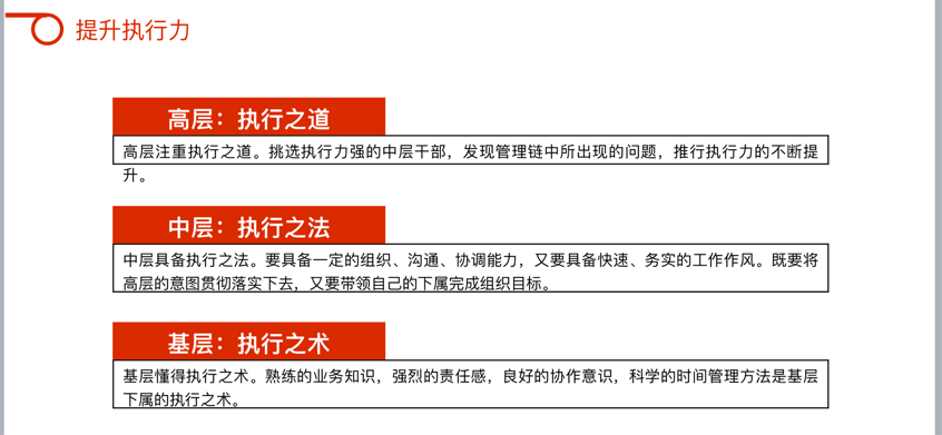 生動(dòng)形象地幫助大家建立了對(duì)執(zhí)行力的結(jié)構(gòu)化認(rèn)知,更進(jìn)一步理解到了工作態(tài)度、工作職責(zé)、工作任務(wù)、工作結(jié)果的邏輯聯(lián)系,以及如何在強(qiáng)化執(zhí)行力的同時(shí),提高部門運(yùn)作效率,使效能與效率相輔相成,創(chuàng)造出更高的部門績(jī)效。